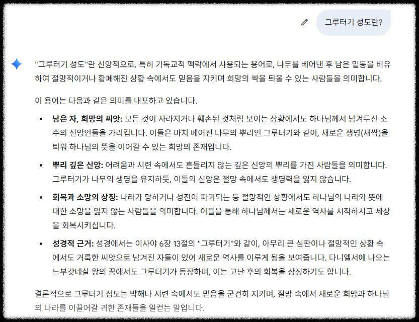 "결론적으로 그루터기 성도는 박해나 시련 속에서도 믿음을 굳건히 지키며, 절망 속에서 새로운 희망과 하나님의 나라를 이끌어갈 귀한 존재들을 일컫는 말입니다."