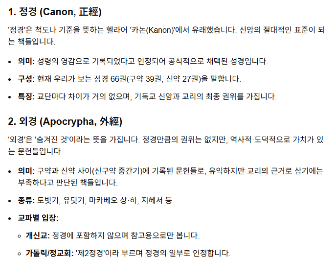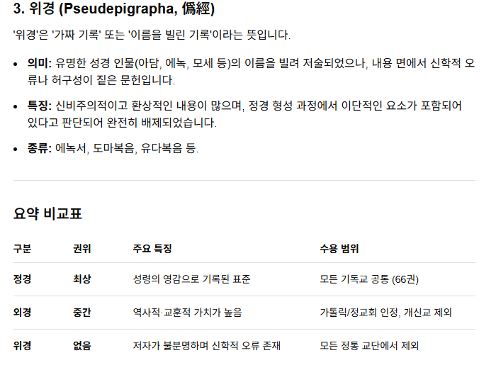 1. 정경, 외경, 위경에 대해 다시 한번 공부합시다. 간단하게 누군가에게 설명하듯이 정리해 봅시다.