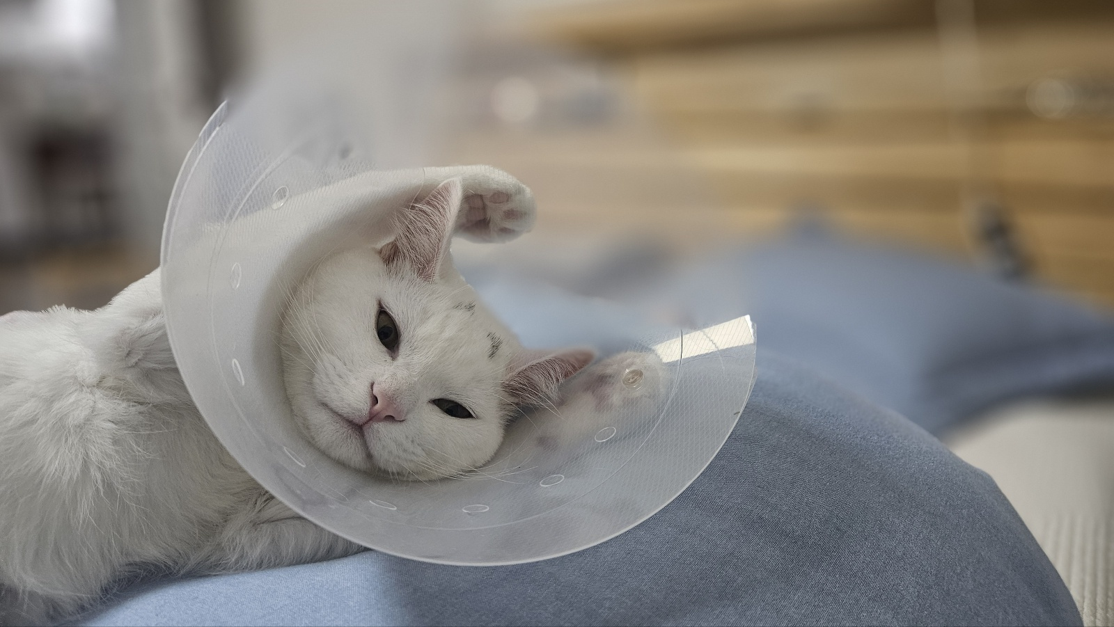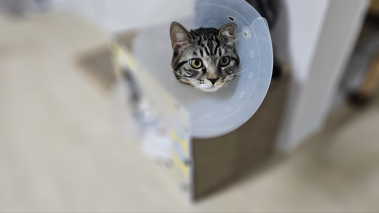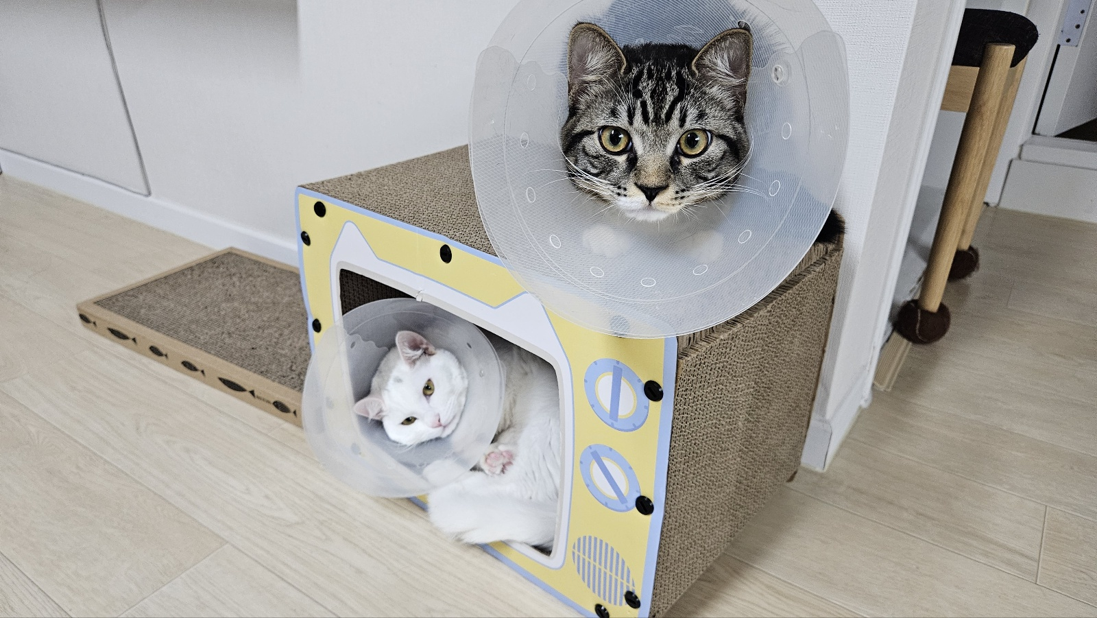 중성화 수술을 하고 넥카라 때문에 불편해하는 고양이들...